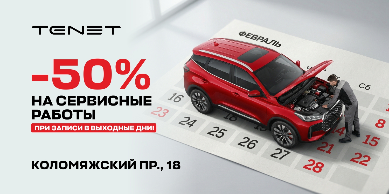 Предложение не суммируется с другими специальными предложениями и акциями. Действует при прохождении технического обслуживания с использованием запчастей и расходных материалов дилера. Акция действительна до 28.02.2026 для клиентов Tenet по адресу Коломяжский пр-кт, д. 18. Все подробности акции — в отделе Сервиса.